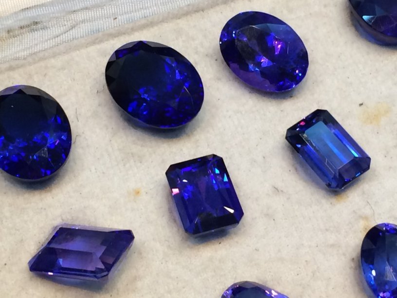 While it may look blue under fluorescent lights, tanzanite actually shows violet and bluish purple when viewed from a different angle. That is why it is often treated to achieve these intense colors.